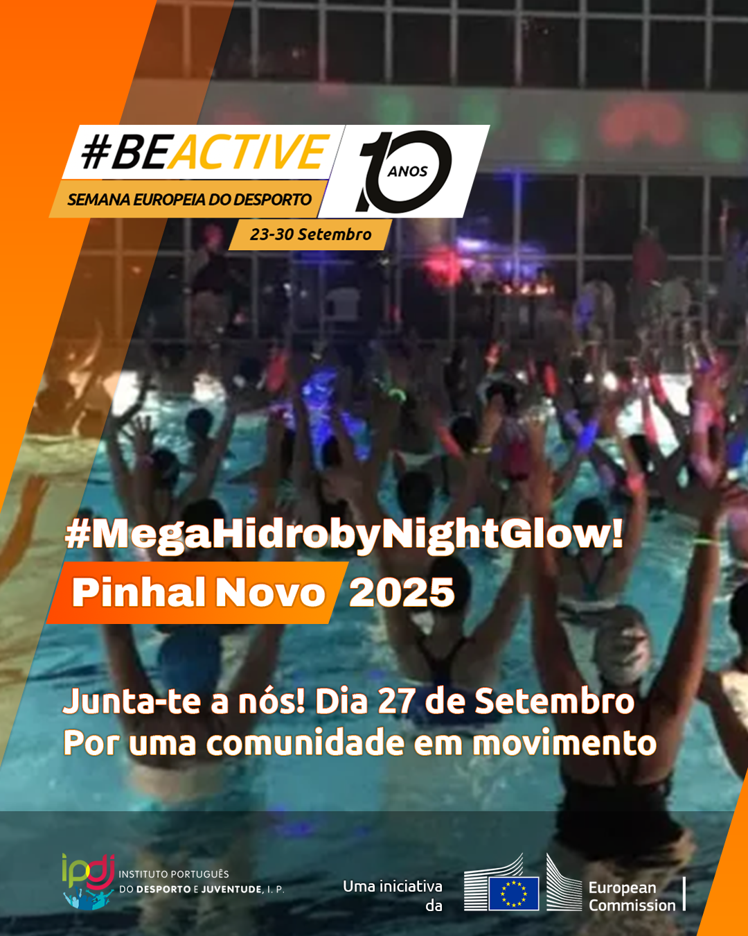 No dia 27 de setembro, mergulha connosco em mais um evento do #BeActive Pinhal Novo 2025 com uma experiência única: Mega Hidro by Night Glow! A Piscina transforma-se num palco iluminado, onde a luz e a música criam um ambiente mágico para celebrar a Semana Europeia do Desporto.